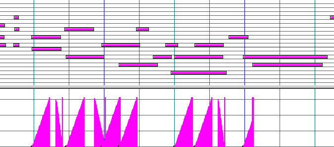 Figure 1 is the screen shot of track 1. Notice how the volume is forced to zero at the start of the note (the black dot at the baseline), the crossfade takes place by raising the volume, holding it there and then dropping it back to near zero. At the end, the volume is forced back to full (the spike at the end of the note).