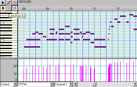 3) This screen shot shows the PIANO ROLL VIEW with PAN events selected for the CONTROLLER display under the note display. This shows graphically how the pan events rise and fall in concert with the pitch of the notes they are associated with.