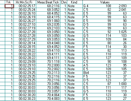 1) This is a screen shot of the EVENT VIEW in Cakewalk before running PIANOPAN.CAL on a right-hand piano track.