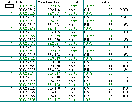 2) Here is the same segment of the sequence after running the PIANOPAN.CAL program. Note how the pan events start one tick ahead of the note and how the chords are clustered and assigned a single pan event for the entire chord.